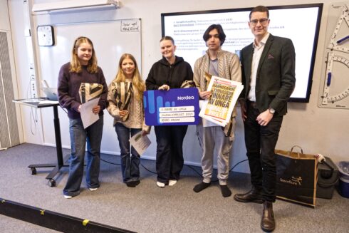 Mira Sundelin, Agda Wikström, Elsa Nilsson och Adam Tartagni tar emot priset av Oskar Nord, Tidningen Ångermanlands chefredaktör. Foto: Emmy Norgren